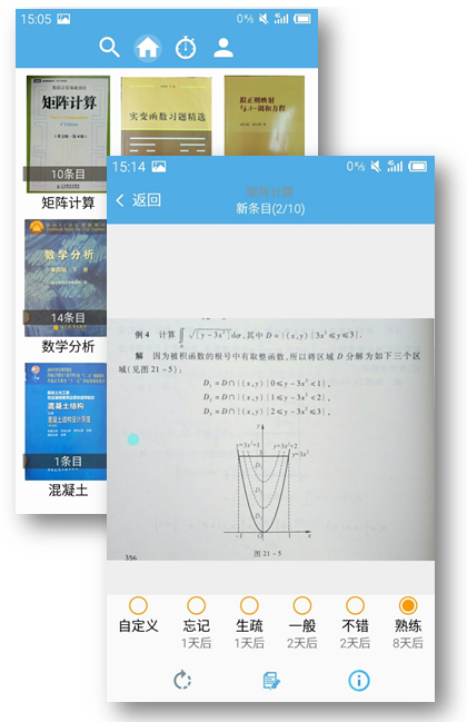 算法基础是SuperMemo 公开的SM2与SM5算法,以及AnyMemo的算法(基于SM2),另外因为SuperMemo现有算法不能生搬硬套用来"试题”、“笔记"等大体量材料上,另一方面"依靠而不依赖于算法"的思想,在上述诸位的基础上进行了一些必要简化与扩充。不过基本思想还是与SM无二的"分级思想”——>为条目设置难度因数EF,通过评分修正这一强度因数,依靠强度因数计算复习间隔。